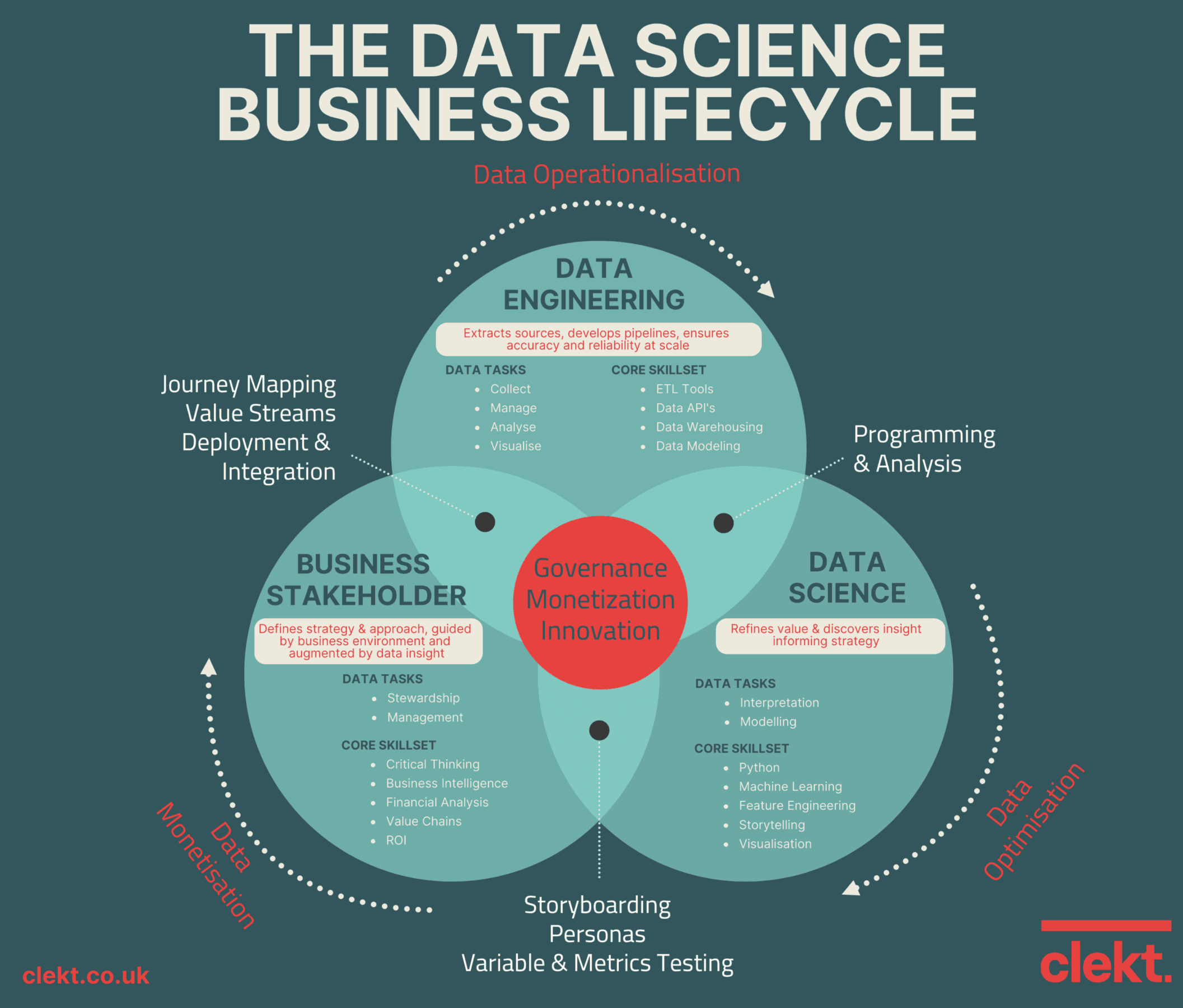 The business stakeholder role within the data science business lifecycle defines strategy guided by the industry and market environment, augmented by data insight. The overarching remit of business stakeholders role within the data science business lifecycle achieves data monetisation.