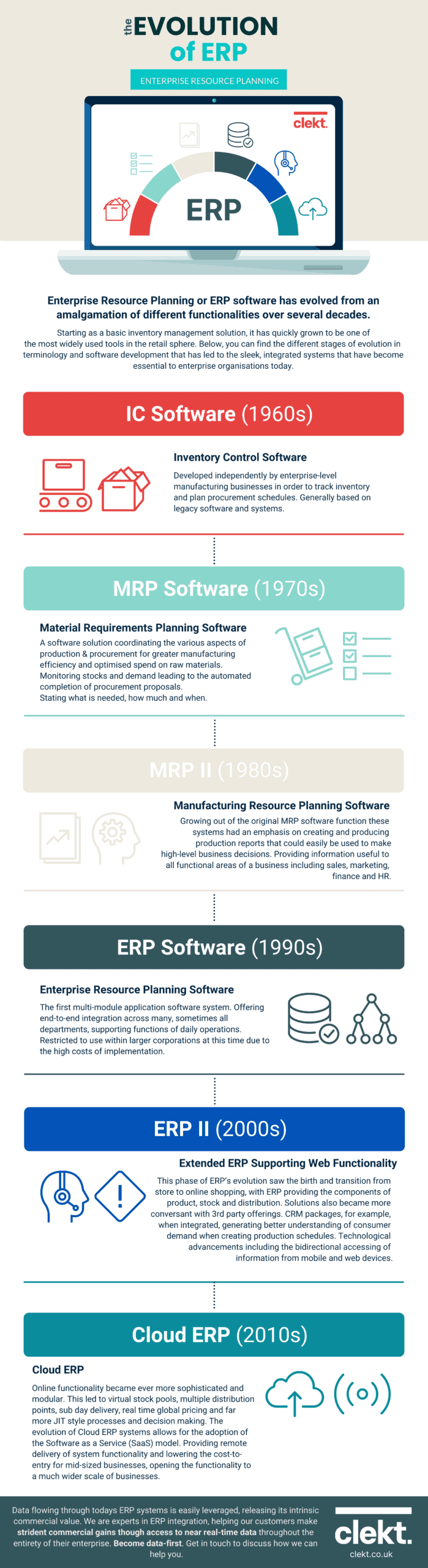 Enterprise Resource Planning systems, or ERPs have evolved over decades into the form we know and work with today. Initially a basic inventory management solution, now combining many operational functions of a business, their full breadth of capability is best understood by seeing the stages of evolution ERPs have experienced. And the various functions tied in with the software powerhouse intrinsic to retail businesses worldwide. Here is our break down of ERP system evolution in an easy to digest form.