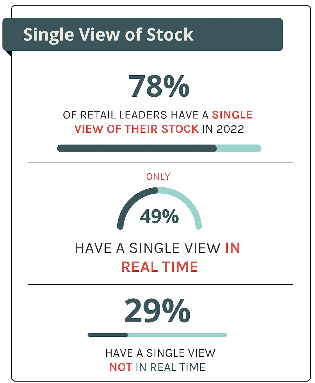 In a survey of over 50 top retail CEOs carried out by Retail Week, only 49% of respondents say they currently have a single view of stock in real time, while 29% have a single view not in real time.